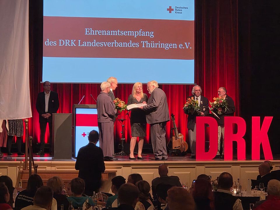 Am 25. Oktober 2025 wurde unser langjähriger Kamerad Hermann Richardt mit der Verdienstmedaille des Deutschen Roten Kreuzes vom Landesverband Thüringen ausgezeichnet. Diese Ehrung gebührt Mitgliedern des DRKs, welche über viele Jahre hinweg ein außergewöhnlich vielseitiges und tief verwurzeltes Engagement für die Grundsätze der Rotkreuzbewegung pflegen. Hermann Richardt prägt unseren Kreisverband seit vielen Jahren sowohl als geschätzter Kollege im Rettungsdienst und Betriebsratsvorsitzenden – mittlerweile im wohlverdienten Ruhestand – wie auch durch sein außergewöhnliches ehrenamtliches Engagement. Besonders hervorzuheben sind in diesem Bereich die Kontinuität, mit der er den Ortsverein Neustadt führt, aber auch seine enge Verbundenheit dem Jugendrotkreuz gegenüber, beispielsweise als langjähriger Hauptschiedsrichter unserer Kreisbegegnungen.